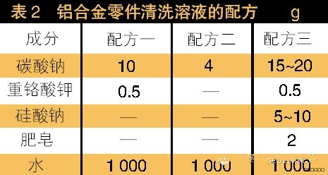 乳化作用是一種液體形成極小的細粒后,均勻分布在另一種液體中。在堿溶液中加入乳化劑形成乳化液,能降低油膜的表面張力和附著力,使油膜破碎成極小的油滴后,不再回到金屬表面,以去除油污。常用的乳化劑有肥皂、水玻璃(硅酸鈉)、骨膠、樹膠、三乙醇胺、合成洗滌劑等。需注意的是清洗不同材料的零件應采用不同的清洗液。堿性溶液對金屬有不同程度的腐蝕作用,尤其對鋁的腐蝕性較強。表1和表2分別列出清洗鋼鐵零件和鋁合金零件的清洗液的配方,供使用時參考。
